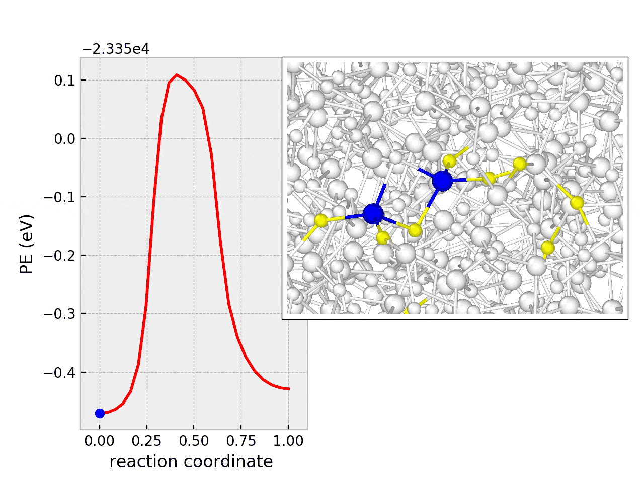 Ball and stick representation of a two-level system (TLS) in glassy silica. Only atoms that participate in the TLS are shown in color. Blue is silicon and yellow is oxygen. The plot on the left tracks the potential energy of the system. Credit: K. Prasai et al.